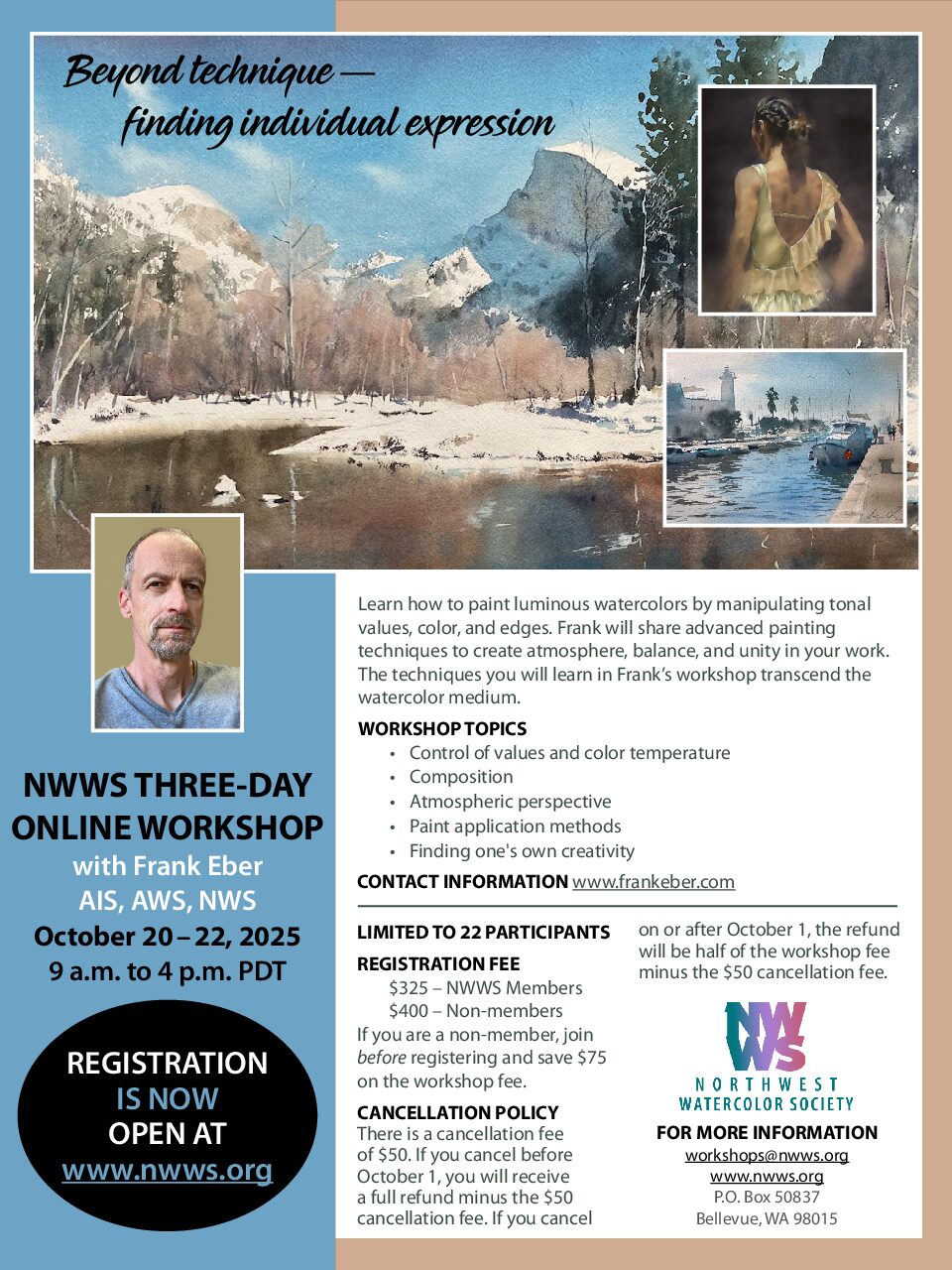 NWWS regularly provides workshop opportunities of the highest quality. All workshops are online. Each Spring, two carefully selected artist instructors provide 2-day workshops. Fall’s workshop is commonly a 3-day workshop. Those who attend may watch the workshop recording for 30 days afterward.
