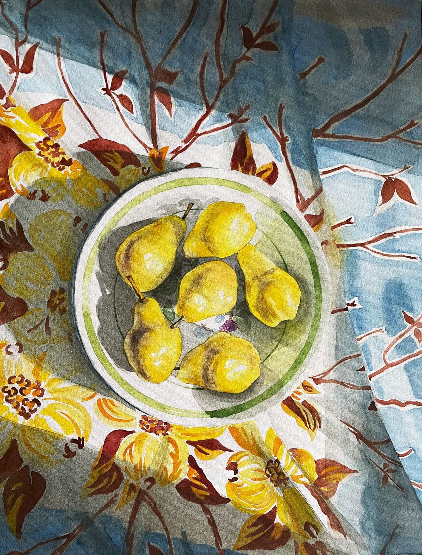 These pears were at the peak of ripeness, and looked so pretty with this vintage table cloth. The light was just right and I knew I'd need to paint it. My favorite bit is the golden glow on the fold in the table cloth reflected from the pears.